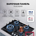 Поверхность: варочная панель • Тип поверхности: газовая • Рабочая поверхность: закаленное стекло • Число конфорок: 4 • Установка: независимая • Газовые конфорки: всего - 4 • Газ-контроль конфорок: есть • Тип управления: механическое • Переключатели: поворотные • Электроподжиг: есть, автоматический • Размеры: 600x510x40 мм • Размер ниши для встраивания: 560x480 мм • Цвет: панель - черный